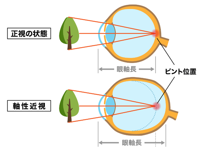 小児期の近視は長時間近くを見続けることで眼軸長(目の奥行)が伸びてしまい、遠くにピントが合わなくなることが主な原因です。